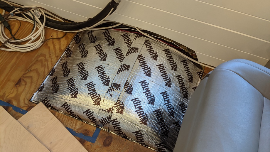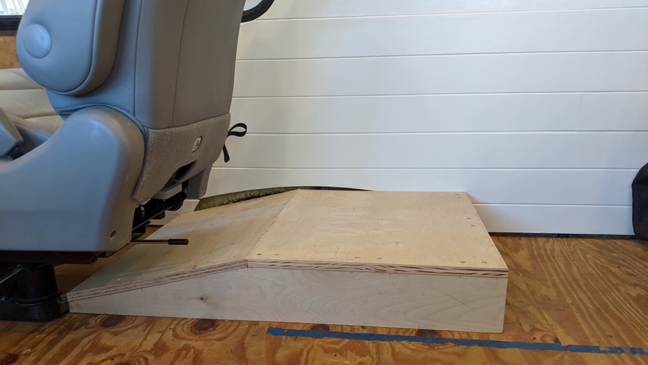 Before we could even begin building the couch boxes, we had to cover the front wheel wells. We started by putting Kilmat (sound deadening mat) down over the wheel wells and then covering that in mineral wool insulation. Next, we needed to build boxes to cover them. The two couches cover about half of each wheel well, so we needed a flat surface on which to build. Of course, it couldn’t just be a simple box, because that would just be too easy! If we built a rectangular box, our driver and passenger chairs would not be able to swivel around. They would have run into that box. We ended up making the box rectangular on one half and ramp down on the other half. Now the chairs can swivel over the ramp.