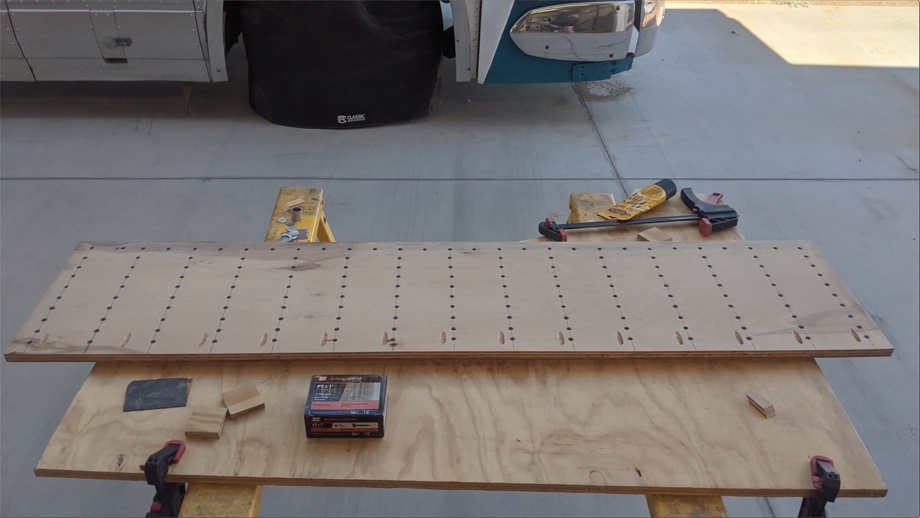 After cutting and treating all of the slats, we screwed them into the back of the front piece of the couch. Before we attached the slats to the sides, we assembled the box in the bus. The fronts and sides were squared up and pocket holed into the subfloors and to each other. We made a cross-support piece to go across the back that is screwed into the metal ribs of the bus as well. Finally, one at a time we aligned each slat on the side with the mitered slat on the front for a perfect corner and screwed it in.