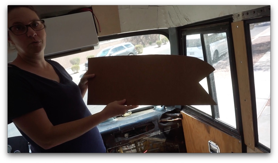 The first step was making the bottom of the cabinets because that had to be the main support. Above the windshield, we used a multi-step process in making a template for the curve and weird corner area that we show in the video. It started with wood, next cardboard, then putting a few pieces of cardboard together, then finally to the final piece of wood with some minor sanding. This weird, crazy looking piece of wood became the bottom of one side of the cabinets. In the front, we were able to screw it into the metal above the windshield. On the sides, we had to make L-brackets out of aluminum angle that we screwed into the side of the bus, and then we were able to screw the wood into that.