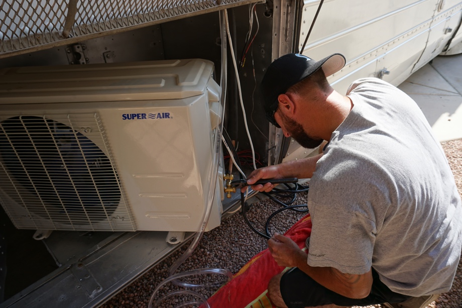 Unfortunately, the standard length of lines that comes with this unit is 16 feet. We needed closer to 27 feet. So, I bought new longer lines. Daniel was then able to help us get the lines in place, cut the replacement lines, and add the new flared fittings. Then, he pressure tested the system with nitrogen and performed a leak-down test. Next, he vacuumed out all the nitrogen and once the lines were clear, he released the freon.