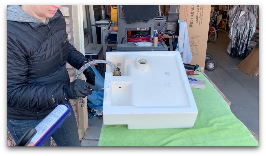 Next up, we glued the sink to the cabinet using our favorite 3M 5200 Fast Cure. Thankfully, our measurements were good and the sink lined up and fit perfectly. Phew! We installed our faucet and finally were ready to take the whole vanity into the bus for installation. Then, we finished the plumbing and wiring up the control panel and outlet.